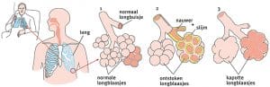 Op de afbeelding staan normale, ontstoken en kapotte longblaasjes bij de longziekte COPD.